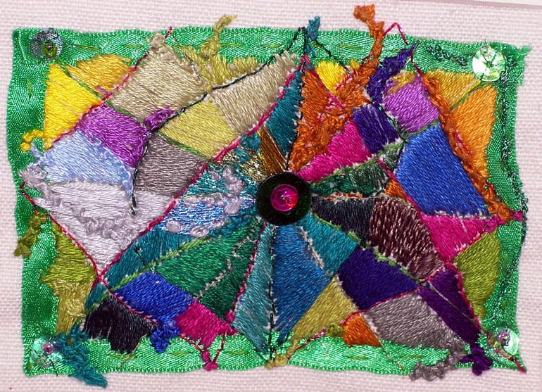 embroidered paintings with acrylic, oils, pastels, beads, sequins, buttons and photos